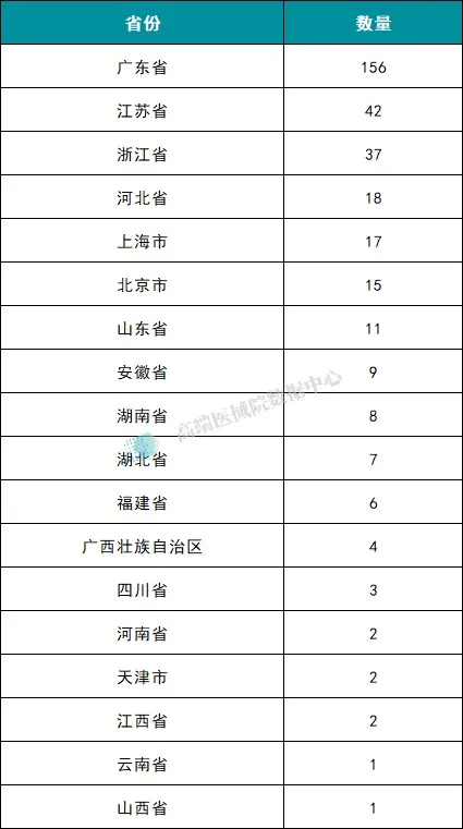 结合图表4数据显示,2022-2025年参与FDA认证的国产医疗器械企业数量从410家缩减至341家,实现连续三年稳步收缩,行业参与主体持续精简。从2025年全年国产医疗器械企业FDA获批榜单看,企业端头部梯队格局稳固,其中:上海联影医疗以17件产品获批登顶榜首,深圳开颜、童品荟(各11件)、迈瑞医疗(10件)等区域龙头紧随其后,凭借深厚的技术积累、充足的资金支撑及成熟的海外合规体系,持续在FDA认证赛道中占据主导地位。腰部企业多以5-8件的获批规模,依托细分赛道的差异化优势寻求突破,但受限于技术迭代速度与合规运营成本的双重制约,与头部企业的差距正逐步拉大。结合头部梯队的稳固表现与整体认证企业数量的下滑趋势可推测,中小厂商因面临市场竞争与合规成本的双重压力,正逐步退出海外认证领域,行业洗牌进程持续深化,迈入高质量发展的深水区。2. 地域分布:广东绝对领先,产业集群驱动资源聚合