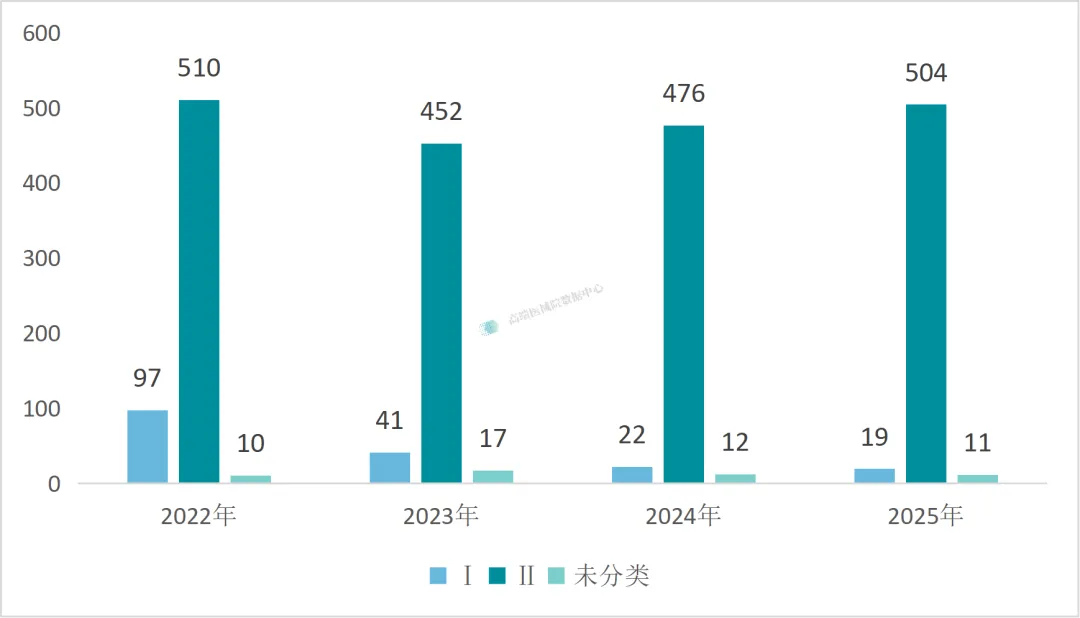 2022-2025 年,中国医疗器械 FDA 获批总数分别为 617、510、510、534 件。2025 年在连续两年企稳后小幅回升,但仍未突破 2022 年的历史高点。这一变化背后,一方面是企业从 “盲目扩张” 到 “理性布局” 的策略转变:另一方面,地缘政治摩擦、海外市场竞争加剧让企业更谨慎地评估投入产出比。此外,FDA 对供应链合规、临床数据真实性的审查趋严,也抬高了中小厂商的申报门槛。中美在医疗器械风险分类上存在一定差异。在中国,依据国家食品药品监督管理总局规定,医疗器械按照风险程度由低到高,管理类别依次分为第一类、第二类和第三类,分类判定需综合考虑医疗器械的预期目的、结构特征、使用形式、使用状态以及是否接触人体等多方面因素。而美国FDA 将医疗器械分为 Class I、Class II、Class III 三类,分类涉及医疗产品的预期用途和使用适应症,Class I 对患者风险最低,Class III 风险最高 。
