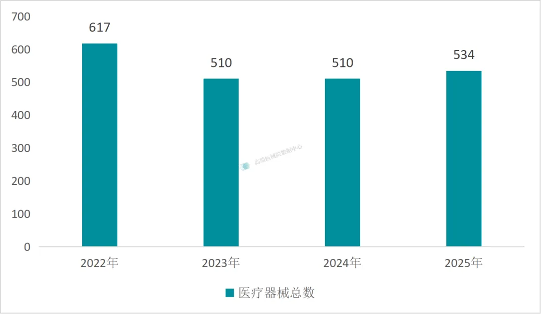2025 年全年,中国医疗器械 FDA 获批总量达 534 件,较上年微增 4.7%,延续温和修复态势;参与认证企业数量连续三年下滑至 341 家,行业出清加速。Ⅱ 类医疗器械以超 94% 的占比筑牢出海基本盘,广东省与上海联影分别在地域和企业维度领跑FDA获批榜单,器械FDA出海整体呈现 “总量稳、结构优、头部聚、集群强” 的特征。