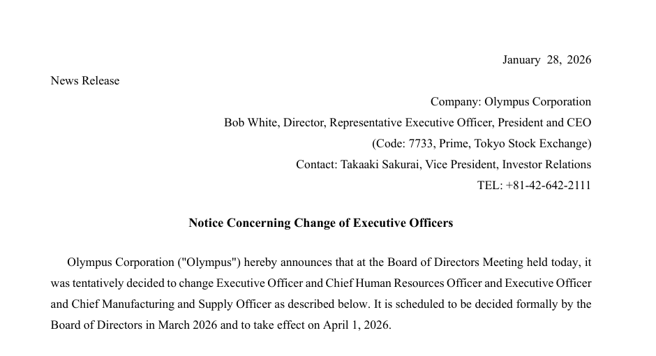 2026年1月28日,奥林巴斯同步官宣全球及中国区双重高管变动,其中中国区人事调整尤为引人关注。 陈小穗(Rosa Chen) 有分析显示,此次陈小穗女士的任命,创下了奥林巴斯两项历史“首次”: 中国区正式升格为全球独立战略区域,首次实现中国区负责人直接向全球CEO汇报; 首次实现核心业务部门与职能部门均向中国区总裁汇报,真正达成对中国市场“端对端”的全链条统筹负责。 陈小穗女士的任命后,现任中国区首席执行官土屋英尚计划于2026年3月底正式退休,并卸任中国区所有法人公司董事长职务,为此次管理层交接画上句号。 此次中国区人事变动,是奥林巴斯全球管理架构革新的重要组成部分。奥林巴斯全球总裁、首席执行官兼董事Robert White同步宣布,自2026年4月起,集团将全面推行全新的区域总裁领导架构,这一调整旨在强化区域市场自主性与执行力,而中国市场作为全球核心增长引擎,其管理层迭代与架构升级被赋予重要战略意义。 公开信息显示,土屋英尚任职期间,为奥林巴斯中国区业务的稳定发展奠定了坚实基础,其退休卸任后,陈小穗将接过重任,带领中国团队适配新架构、冲刺新目标。 奥林巴斯同时公布了全球层面的高管变动计划。在今日召开的董事会会议上,公司暂议调整高管兼首席人力资源官、高管兼首席制造与供应链官职位,相关变动计划于2026年3月由董事会正式决议,2026年4月1日起生效,与中国区新架构落地形成时间上的协同。 具体来看,现任高管兼首席人力资源官Shigeto Ohtsuki先生因制度改革达成重要里程碑,已表达卸任意向。其接任者Simone Berger女士拥有德国、新加坡及中国的多元全球运营经验,擅长文化与人才转型及矩阵式管理,将助力集团深化全球人力资源整合与文化转型。 现任高管兼首席制造与供应链官Tetsuo Kobayashi先生,已完成生产体系优化、供应链重组等筹备工作,卸任后将由David Shan先生接任。David Shan先生拥有30余年全球知名企业运营经验,业务覆盖制造、供应链、研发、质量管控等多领域,将牵头建立业务为中心的精简运营模式,强化全球供应链协同。 作为行业资深管理者,陈小穗女士的加盟被视作奥林巴斯深耕中国市场的关键布局。她毕业于美国Thunderbird管理学院,拥有市场营销和国际管理专业MBA学位,在医疗健康行业跨国公司积累了20余年企业管理经验,足迹覆盖市场营销、销售、商业战略策划等多个核心部门,具备全面的业务操盘能力与跨领域资源整合能力。 陈小穗女士的职业履历亮点纷呈,尤其在丹纳赫集团任职期间的表现备受行业认可。 2021年9月加入丹纳赫后,她肩负起集团医疗诊断DBS业务系统的核心职责,凭借卓越的领导力实现快速晋升:2022年2月升任贝克曼库尔特诊断中国区副总裁兼总经理,主导商业团队高效运转;2023年1月职责范围进一步拓展,将Dx制造、Dx-County、数字化及大客户管理等职能纳入统筹;2024年1月再度晋升为丹纳赫中国诊断平台总裁,统管贝克曼库尔特、雷度米特、徕卡等旗下核心诊断业务,跻身丹纳赫中国领导团队核心圈层。丹纳赫在内部邮件中高度评价其贡献,称其“对诊断业务做出了重要且持久的贡献”,并肯定了她在组织协作、本土创新、DBS体系推进等方面的突出能力。 值得一提的是,陈小穗在任期间,积极推动新质生产力落地,主导的本土研发制造项目达到工业4.0标准,成功推出契合中国临床需求的免疫诊断产品,为奥林巴斯中国区业务的本土化创新与升级提供了宝贵经验借鉴。 2025年2月,奥林巴斯公司宣布对其业务运营进行全面重组。公司代表执行官兼前首席执行官Yasuo Takeuchi在发布2025财年第三季度业绩时宣布了这些变化。Takeuchi是因Stefan Kaufmann于12月承认毒品指控而临时接任的。此次重组旨在提升公司运营效率,进一步以患者和客户为中心。在重组中,奥林巴斯将加强对每个业务部门的关注,并在全球管理层与本地销售团队之间建立直接联系,以促进协作,加强全球与区域战略的一致性。 作为重组计划的关键一环,奥林巴斯将内窥镜解决方案部门(ESD)和治疗解决方案部门(TSD)合并为胃肠解决方案部门(GIS)和手术与介入解决方案部门(SIS)。新的GIS部门将专注于胃肠道内窥镜检查、胃肠道内窥镜治疗和医疗服务,而SIS部门则将涵盖泌尿外科、呼吸外科和外科手术等领域。 2025年4月 25 日,奥林巴斯宣布任命美敦力前执行副总裁兼内外科产品组合总裁鲍勃·怀特为其首席执行官(CEO)。Bob在2024 年 4 月之前,他曾担任美敦力亚太区高级副总裁兼总裁,常驻新加坡,负责亚太地区和日本事务。在 Covidien 任职期间,他曾担任新兴市场总裁和呼吸和监测解决方案总裁。在加入美敦力之前,Bob 曾在 GE医疗、Merge Healthcare 和 IBM 医疗保健部门担任领导职务。Bob在亚洲任职期间曾主导东南亚市场本地化供应链建设,其“以产促销”策略或为奥林巴斯中国区改革提供范本。 鲍勃·怀特近期也宣布了奥林巴斯将于2026年初发布全新十年战略,延续“发明首台医用内窥镜”的开拓精神。该战略将聚焦三大方向:一次性内窥镜的规模化应用、传统内窥镜的AI深度赋能,以及机器人技术的持续投入。 作为战略核心,奥林巴斯于2025年7月与私募股权公司Revival Healthcare Capital联合成立Swan EndoSurgical子公司,专注开发全球首创的胃肠道腔内手术机器人系统。该项目采用“初创速度+母公司技术”的混合模式,既保持独立决策灵活