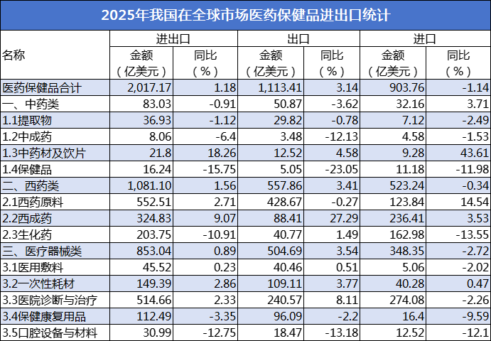 为厘清企业出海的机遇与挑战,《医药经济报》特别推出“向海图强”专题系列报道,全景透视中国药械出海进程,助力产业高质量发展。 2025年,中国医药保健品对外贸易在复杂多变的国际环境中展现出强大的韧性与结构性亮点。进出口总额2017.17亿美元,同比增长1.18%。其中,出口额1113.41亿美元,增长3.14%;进口额903.76亿美元,下降1.14%,贸易顺差209.65亿美元。整体呈现“出口动能增强,进口结构优化”的特征。