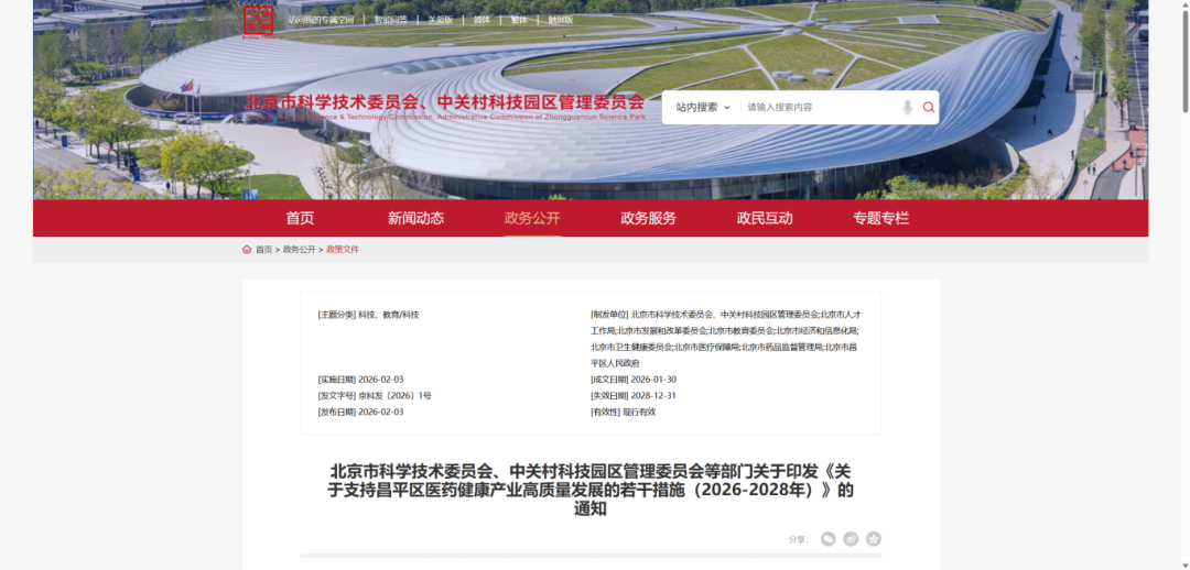 近日,北京市科学技术委员会、中关村科技园区管理委员会等部门关于印发《关于支持昌平区医药健康产业高质量发展的若干措施(2026-2028年)》的通知,,以“一园两城一区”为核心,从创新策源、产业集聚、国际合作等维度构建全链条扶持体系。 全文如下: 北京市科学技术委员会、中关村科技园区管理委员会等部门关于印发《关于支持昌平区医药健康产业高质量发展的若干措施(2026-2028年)》的通知 京科发〔2026〕1号 各有关单位: 现将《关于支持昌平区医药健康产业高质量发展的若干措施(2026-2028年)》印发给你们,请结合实际认真贯彻落实。 北京市科学技术委员会、中关村科技园区管理委员会 北京市人才工作局 北京市发展和改革委员会 北京市教育委员会 北京市经济和信息化局 北京市卫生健康委员会 北京市医疗保障局 北京市药品监督管理局 北京市昌平区人民政府 2026年1月30日 (此件主动公开) 关于支持昌平区医药健康产业高质量发展的若干措施(2026-2028年) 为加快推动昌平区医药健康产业高质量发展,以中关村生命科学园、国际医疗器械城、未来美城、合成生物制造产业集聚区“一园两城一区”为核心,联动海淀区激发北部地区医药健康原始创新活力,协同南部地区推进创新链与产业链深度融合,助力全市医药健康产业创新提效、发展提质、开放提级,特制定本措施。 一、提升创新策源能力 (一)强化原始创新策源 依托国家战略科技力量及新型研发机构等,加强前沿基础研究和关键核心技术攻关,催生一批全球领先的标志性原创成果。支持设立自然科学基金联合基金,围绕医药健康领域的关键科学问题和产业需求,开展基础研究和应用基础研究。支持组建创新联合体,对于具有高水平研发团队、能够显著引领促进产业发展的高能级创新平台给予资金支持,支持北京合成生物制造技术创新中心争取成为国家级创新平台。(市科委中关村管委会、昌平区政府) (二)提升临床研究水平 加强与国家医学中心、国家临床医学研究中心深度合作,持续提升昌平区临床研究水平。支持医企合作开展全球早期同步研发和国际多中心临床试验。支持创新药械企业与医疗卫生机构合作开展创新药械真实世界研究、上市后评价、适应症拓展研究等。(市卫生健康委、市科委中关村管委会、市药监局、昌平区政府) (三)加快创新成果转化 支持围绕医工交叉等方向建设概念验证平台、技术转移机构,加强技术转移人才培养,提升技术转移服务水平,打造科学家创业第一站。积极争取全国高校区域技术转移转化中心落地,支持高校、科研院所围绕生物医药技术产业化、新工科+医学交叉等方向布局,加速创新成果转化落地。支持企业牵头成立产教研医联合的医工交叉创新转化中心。(市科委中关村管委会、市经济和信息化局、市教委、市卫生健康委、昌平区政府) (四)夯实AI+医药健康要素基础 鼓励医疗机构、高校院所、企业共建医疗健康高质量数据集,强化多组学、临床试验、健康诊疗等数据整合和共享利用。积极推动中关村生命科学园三期等重点区域部署建设生物医药领域专业化智算设施,为昌平区创新主体提供算力支持。对符合条件使用智能算力的企业,通过市级算力券给予补贴。(市发展改革委、市经济和信息化局、市科委中关村管委会、市卫生健康委、市医保局、市政务和数据局、昌平区政府) (五)加快AI+医药健康示范应用 鼓励高校院所、企业、医疗机构联合开发生命科学基础大模型和医药应用垂类模型,助力提升药物研发和临床诊疗效率。支持医疗卫生机构联合垂类大模型企业挂牌AI实体医院,实现AI+医疗产业生态协同发展。支持围绕AI+药物研发、辅助诊断等方向打造一批标杆示范场景,对符合条件、示范性强的项目给予不超过项目工程投资总额30%、最高5000万元的资金支持。(市发展改革委、市卫生健康委、市科委中关村管委会、市医保局、市药监局、昌平区政府) 二、强化产业发展支撑 (六)加快创新药械研发上市 支持具有显著临床价值、创新性强的品种研发。将昌平区优质创新药械品种纳入项目制服务。强化国家药品监督管理局医疗器械技术审评中心医疗器械创新北京服务站、北京药品医疗器械创新服务站(北站)等服务能力建设,推动成立北京市化妆品原料创新服务站,建立企业与监管机构的前置沟通机制,加快创新药械上市和产业化进程。(市科委中关村管委会、市药监局、昌平区政府) (七)完善产业服务平台体系 聚焦合成生物制造、细胞与基因治疗、脑机接口等前沿技术领域,高端医疗器械、美丽健康等重点产业赛道,支持科技服务业企业效能提升,对于符合条件的,按照规定给予不超过2000万元资金支持。支持打造创新医疗器械临床应用培训推广中心,搭建医企对接平台,加速创新产品推广应用。支持成立产业创新发展联盟,整合多方力量共同开展标准制定和产业资源对接,服务产业创新发展。(市科委中关村管委会、市发展改革委、市经济和信息化局、市卫生健康委、市国资委、昌平区政府) (八)探索创新药械多元支付方式 支持商业健康保险公司与昌平区创新医药企业合作开发特定疾病险、特定药品险等商业健康保险产品,将价格合理的创新药械纳入保障范围。积极引导商业健康保险针对相关险种组成共保体,探索建立创新医药风险调节机制
