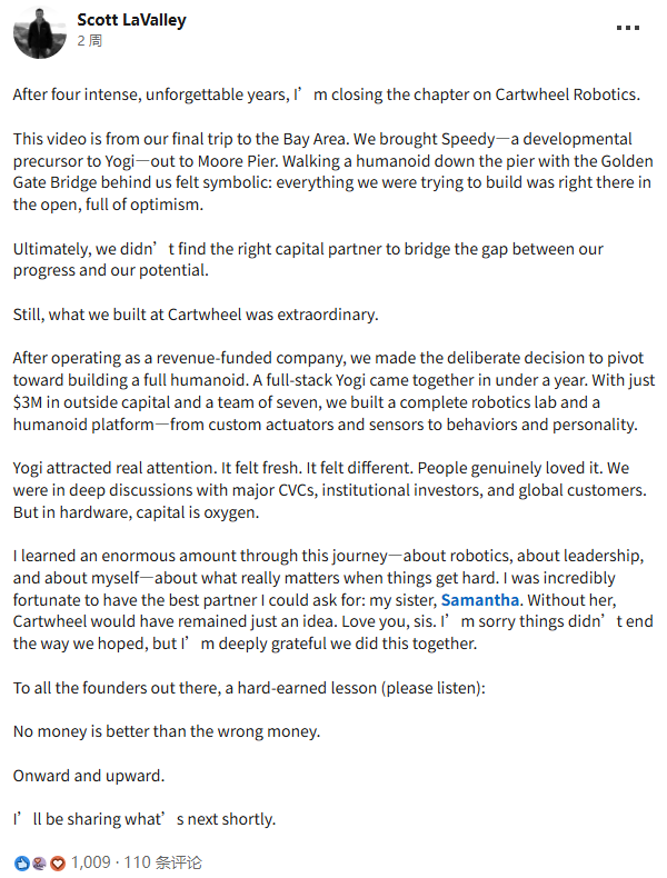 从融资历程来看,Cartwheel Robotics始终未能获得资本的足够青睐。该公司2022年成立后,通过自身营收及少量外部投资,累计融资近300万美元。最后一笔融资发生在2025年6月,加拿大投资公司New Wave仅进行了15万美元(约合人民币102万元)的战略投资。▲LaValley在LinkedIn发布的告别公告 2月7日,LaValley在LinkedIn发文,详细复盘了倒闭原因,“在硬件领域,资金就是氧气”,他直言,Cartwheel Robotics最终未能找到合适的资本合作伙伴,无法弥合当前发展进展与未来潜力之间的差距——这正是压垮这家初创企业的最后一根稻草。回顾四年历程,LaValley感慨万千。团队最后带着原型机Speedy前往摩尔码头,在金门大桥的映衬下完成最后一次展示,“我们努力打造的一切都清晰可见,充满了希望”。尽管最终未能走到最后,但他对团队取得的成就倍感自豪。值得关注的是,LaValley在公告末尾向所有创业者发出警示:“没有钱也比错误的资金好。” 这句话背后,或许暗含着公司在融资过程中遭遇的困境——在资本寒冬中,饥不择食的融资选择可能比拿不到钱更危险。Cartwheel Robotics的倒下,折射出当下人形机器人赛道的残酷现实。一方面,行业头部公司动辄获得数亿美元融资;另一方面,中小型创新企业却面临资金枯竭的困境。技术情怀与商业潜力之间的鸿沟,成为横亘在无数初创公司面前的生死线。那个试图用家庭陪伴机器人传递温暖的团队,终究没能等到资本的回心转意。