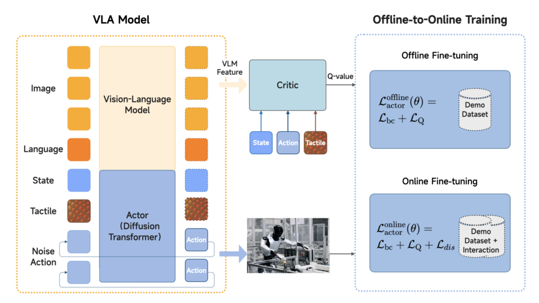 最终,它不直接输出单一动作,而是生成一个“动作块”,并通过机器人传输至在线微调架构中。