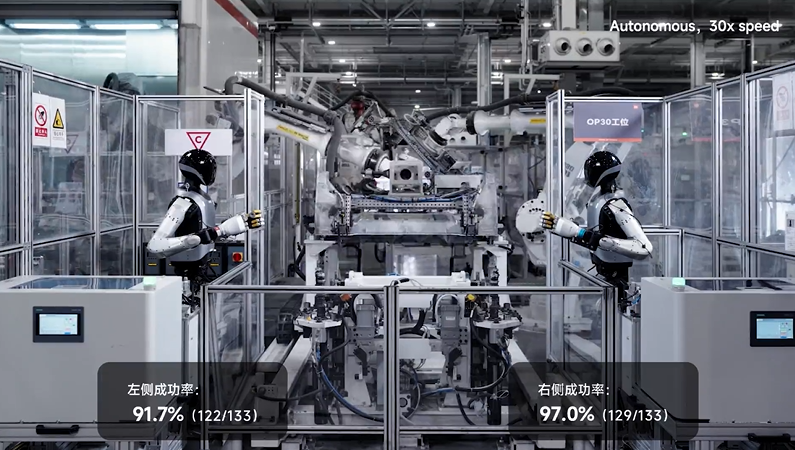 这是第一次有厂商主动披露人形机器人在真实工况下的实测数据,据显示,左侧机器人成功率为91.7%,右侧则达到97%;双侧同时安装成功率为90.2%,同时满足了最快76秒的产线生产节拍要求。
