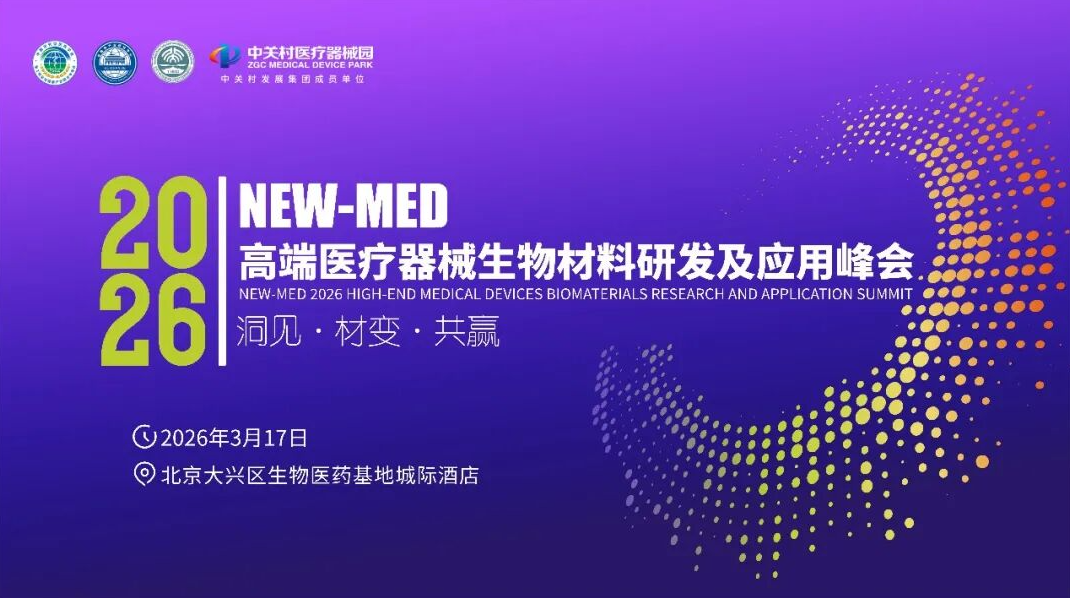 NEW-MED 2026 高端医疗器械生物材料研发及应用峰会将于2026 年 3 月 17 日在北京大兴生物医药基地城际酒店隆重举办。 本次峰会以 “洞见・材变・共赢 ” 为主题—— 聚焦高端医疗器械生物材料革新,共筑医疗产业新生态,覆盖血管、骨科、齿科、医美四大核心领域,通过圆桌讨论、项目路演、企业专访、供需对接、园区参观等多元形式,汇聚海内外 400 + 科研院所、企业、医疗机构、投资机构等行业精英,搭建精准资源匹配与成果转化平台,助力参会者把握行业趋势、拓展合作渠道,为产业高质量发展注入强劲动力。 |
