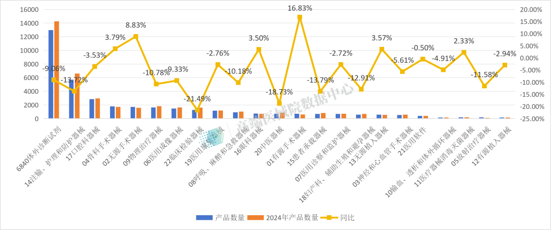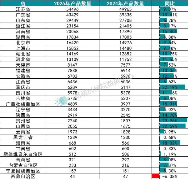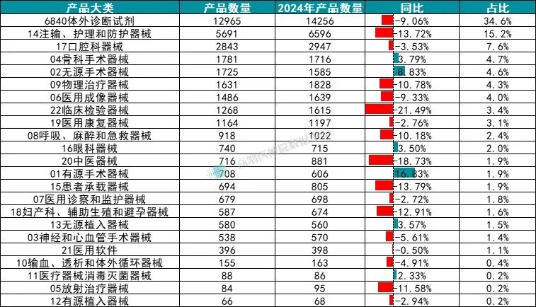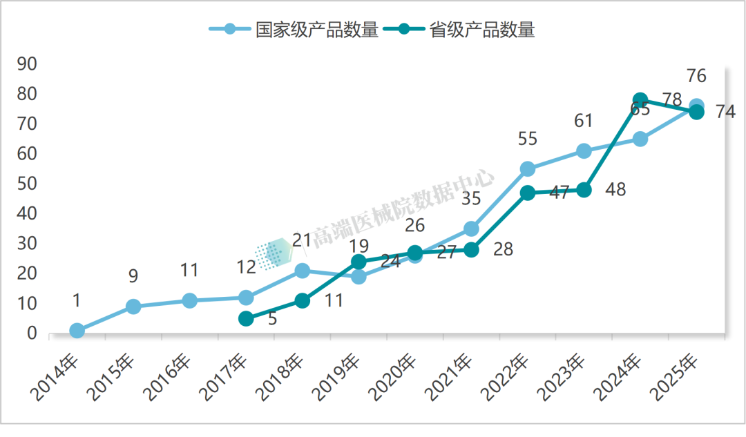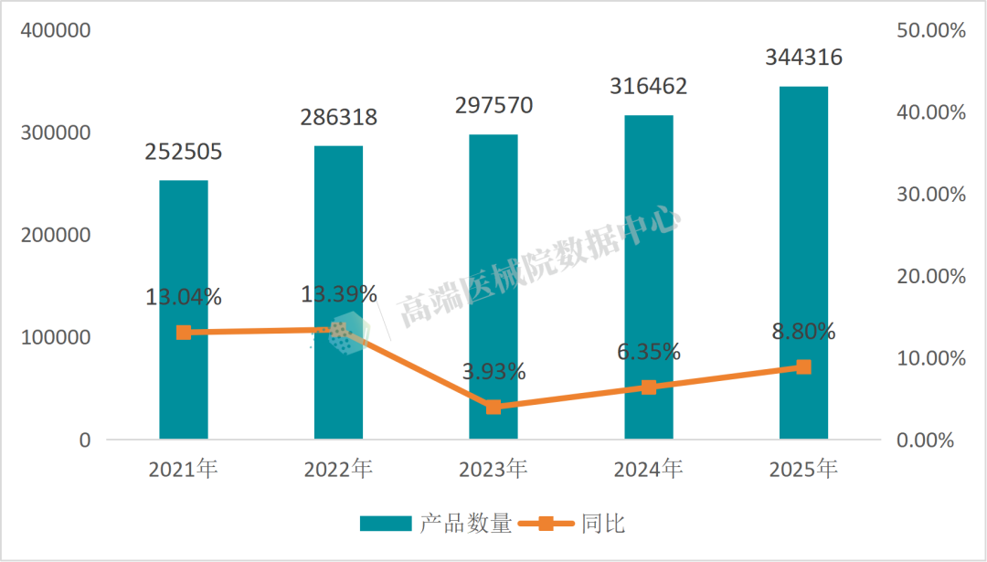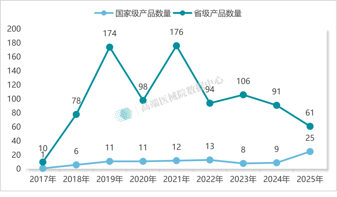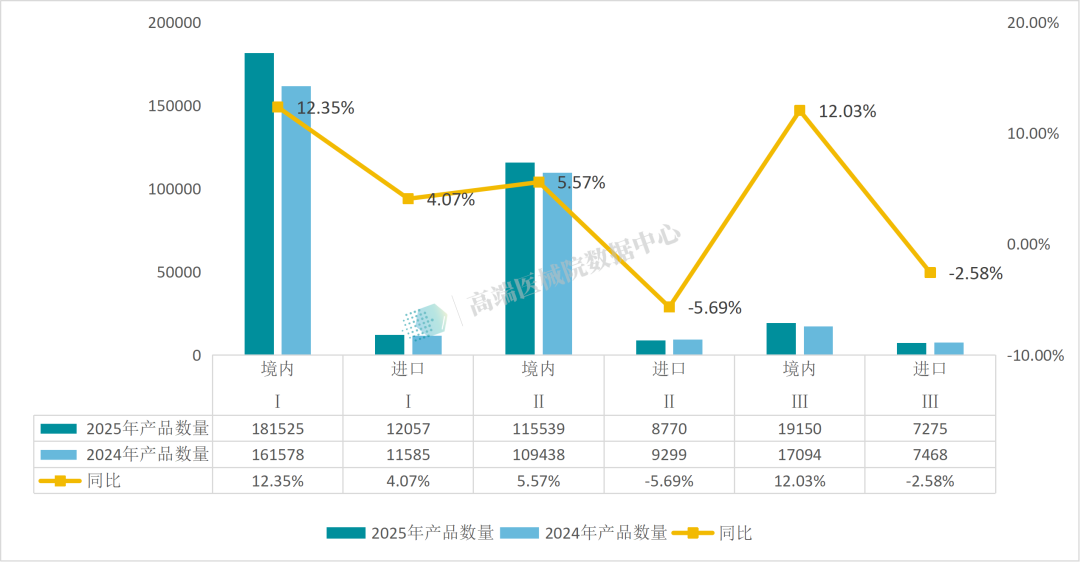 截至2025 年底,全国医疗器械注册备案产品总量达 344316 件,较 2024 年同比增长 8.80%,既实现市场规模的稳健扩容、结构向本土主导方向优化,更在深度学习软件类热门赛道与手术机器人等高端品类领域迎来供给突破,行业高质量发展态势凸显。 本文将基于2025年全年的医疗器械产品数据,从产品总量、品类分布到区域格局、高端细分品类等多维度拆解、剖析行业现状与趋势,为从业者、监管方及研究者提供参考。 一、整体市场 规模再创新高,同比增长8.80% 图表1:近5年产品数量及同比情况 注:2025年数据统计截至2025年12月31日 2021-2025 年,产品数量从 252505 件增至 344316 件,连续五年扩容。增速呈阶段性波动:2021-2022 年保持 13%+ 高增,2023 年回落至 3.93%,2024-2025 年回升至 6.35%、8.80%,回归稳健增长。 整体呈“快速扩张 - 阶段性调整 - 稳健增长” 的发展轨迹。 图表2:2024-2025年各类医疗器械产品数量同比 2025 年底,全国医疗器械产品总量达 344316 件,较 2024 年的 316462 件同比增长 8.80%。其中 Ⅰ、Ⅱ、Ⅲ 类医疗器械产品数量均实现正增长,增幅区间覆盖 4%-12%;Ⅰ 类医疗器械的同比增幅最为突出,达到 11.79%,行业整体保持稳健扩容节奏,市场规模持续向更高量级拓展。 图表3:2025年全国各类医疗器械产品数量及占比情况 从品类占比维度看,2025 年全年医疗器械产品中,境内 Ⅰ 类医疗器械的数量占比达52.72%,在所有品类中占比最高,稳居市场主力地位。其中进口 Ⅲ 类医疗器械的占比情况最低,仅占全盘的2.11%。 图表4:2024&2025年全国各类医疗器械产品数量同比情况 从境内与进口产品的同比表现来看,2025 年呈现明显分化:进口端中,Ⅱ 类、Ⅲ 类医疗器械产品数量同比分别下跌 5.69%、2.58%;而境内端增长动能强劲,其中境内 Ⅰ 类、Ⅲ 类医疗器械的同比增幅领跑,分别达到 12.35%、12.03%。 综合三个图表可知,2025 年医疗器械市场呈现 “规模稳增、结构分化” 的特点:市场总量同比增 8.80%,Ⅰ、Ⅱ、Ⅲ 类产品均实现正增长,行业扩容节奏稳健;境内产品(尤其是 Ⅰ、Ⅲ 类)增长强劲且占比主导,进口 Ⅱ、Ⅲ 类数量下滑、占比偏低,既彰显国内供给能力提升,也反映市场正向本土主导的结构优化。 二、首次注册/备案 总量充足,主力品类增速放缓 图表5:2025年首次注册/备案产品数量 2025 年医疗器械首次注册 / 备案产品总计 37503 件,其中 Ⅰ 类(20451 件)占比超 54%,是本年度新增供给的核心主力。 图表6:2025年各类型医疗器械首次注册、备案产品数量 图表7:2025年首次注册、备案产品类型分布同比变化 从产品大类维度看,体外诊断试剂以12965 件的数量居首(占比 34.6%),但同比下滑 9.06%;输注、护理和防护器械(5691 件)、口腔种植体器械(2843 件)等主流品类同步走弱,同比分别下降 13.72%、3.53%,呈现 “规模靠前但增速回落” 的特征。 品类间同比表现分化明显:有源手术器械是全年同比增长最高的大类,增幅达到16.83%;临床检验器械则为同比降幅最大的品类,降幅达到21.49%。 图表8:2025年首次注册/备案产品类型分布情况 细分品类中,有源植入器械与放射治疗器械的首次注册量是全年最少的两类,这一现象或与其高精尖的产品属性、更高的技术与监管门槛直接相关。 三、创新审批与获批 审批通道覆盖:国家级与省级协同扩容,扶持力度持续加码 图表9:2025年进入创新/优先审批通道产品数量 2025 年进入各级创新与优先审批通道的产品数量显著提升:国家级层面,创新通道 122 件、优先通道 24 件;省级层面,创新通道 138 件、优先通道 69 件。 通道内产品总量的增加,直观体现监管端对创新医疗器械的扶持力度持续加大,通过 “国家 + 省级” 双层级布局,为不同层级、不同领域的创新产品提供更适配的加速路径。 获批数量特征:国家级创新创近年峰值,省级优先呈波动回落 图表10:2014-2025年创新获批产品数量 图表11:2017-2025年优先获批产品数量 2025 年创新与优先获批产品整体达近年高位,但层级间表现分化: 国家级:创新获批76 件、优先获批 25 件,两项数据均为近年峰值,凸显国家级审批对高价值创新产品的落地支撑力; 省级:创新获批74 件,与近年水平基本衔接;但优先获批 61 件,较历史峰值(2021 年 176 件)明显回落,且 2019-2025 年省级优先获批数量整体呈无规律波动态势,这一现象或与省级优先审批的评判标准逐步趋严、对产品临床价值与创新度的审核维度细化相关。 历年趋势:国家级创新增长显著,商业化落地节奏加快 从长期趋势看,创新医疗器械的审批效率与落地速度持续提升:其中国家级创新获批产品数量增长最为突出,从2014 年的 1 件稳步增至 2025 年的 76 件,11 年间实现量级跨越,充分反映创新产品从研发到商业化的落地周期不断缩短,行业创新活力的释放节奏明显加快。 |