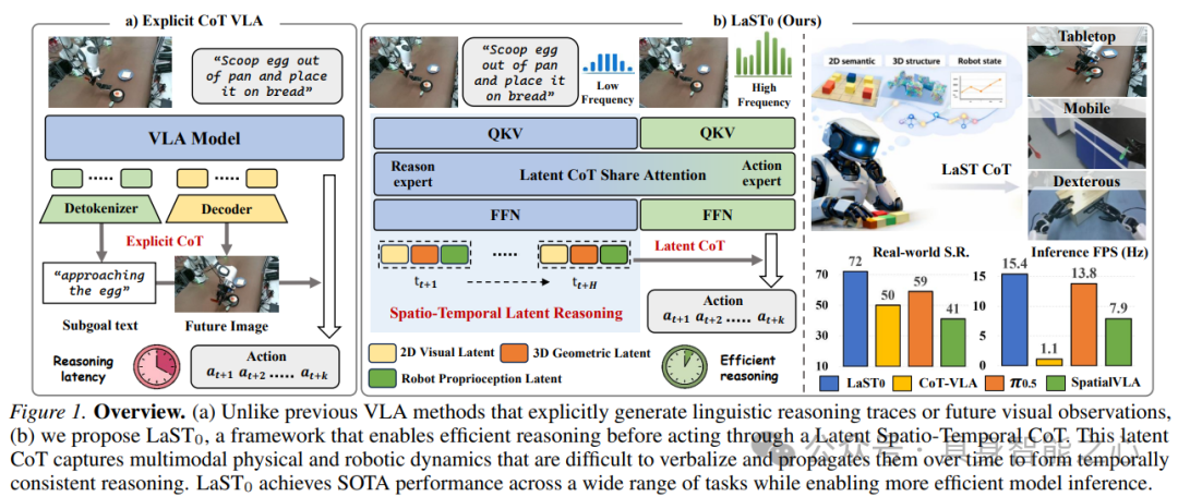 (1)LaST₀基座模型:首次将世界模型对物理世界的理解、预测及VLA的快慢思维融合,显著提升对物理世界动态的高效推理能力,解决机器人怎么“一边想一边快速动”的难题;