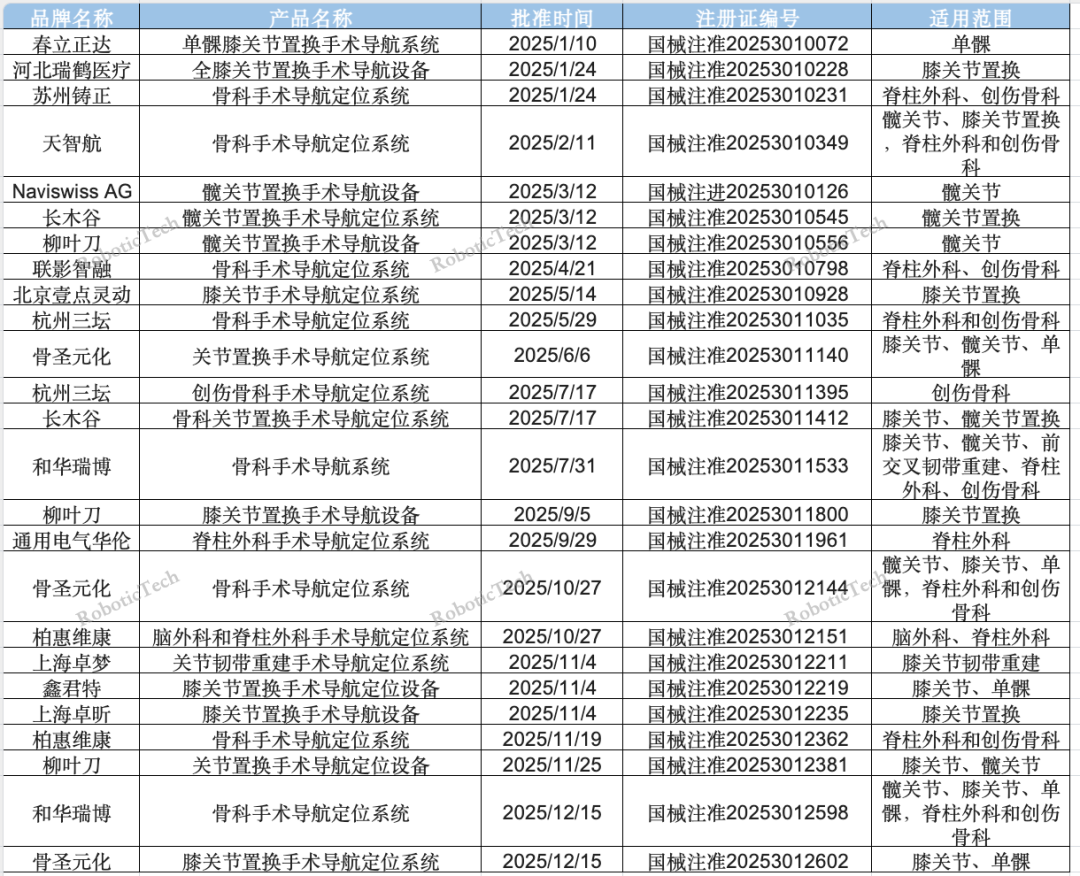 2025年骨科机器人新拿注册证汇总
