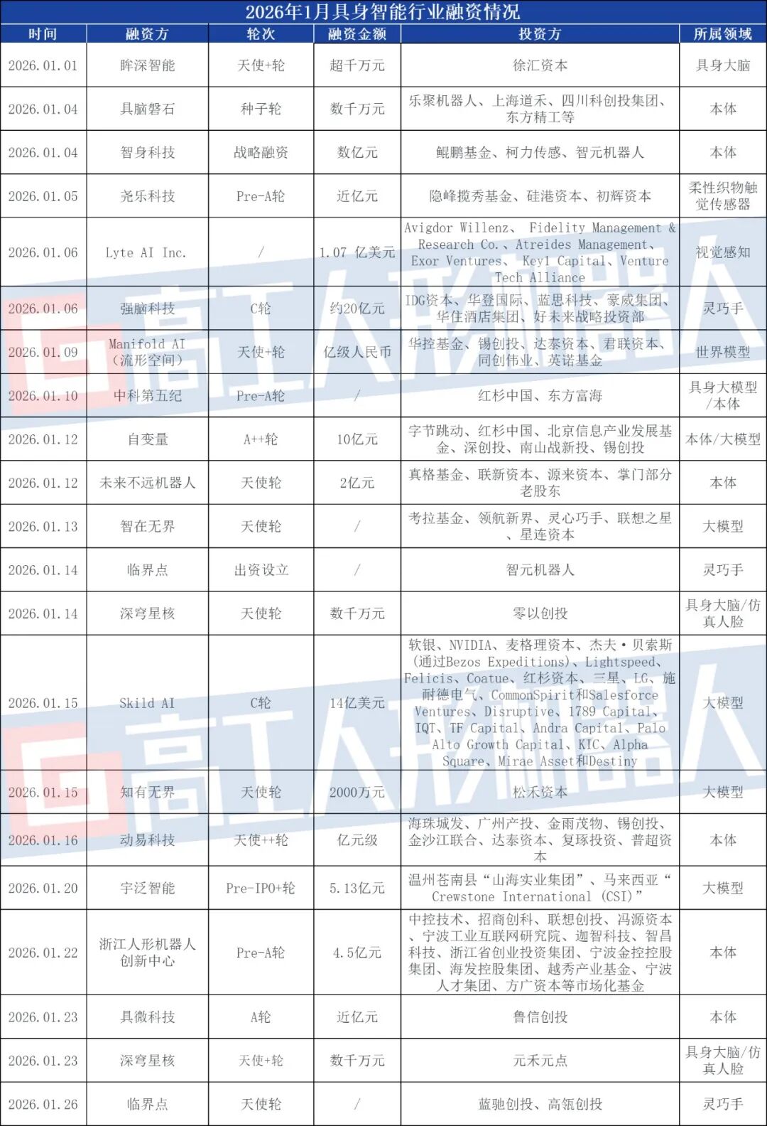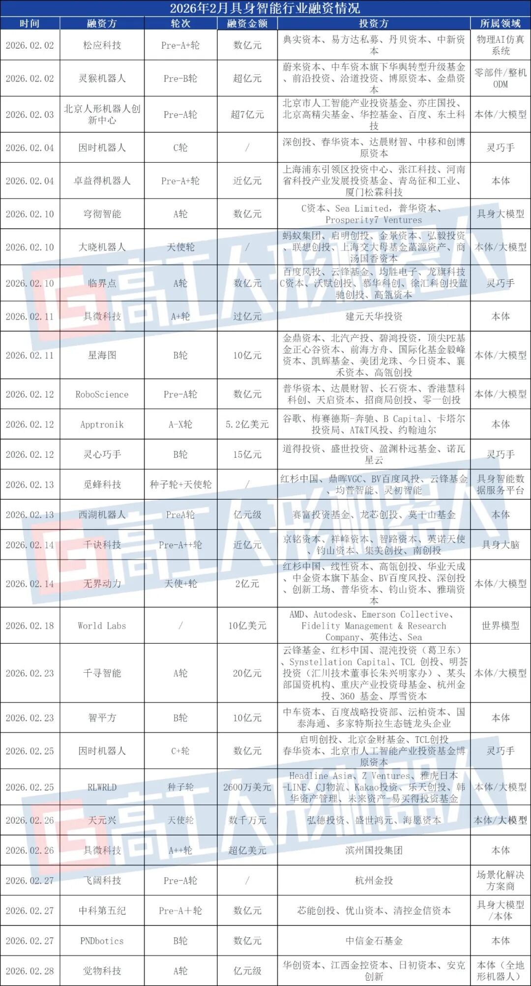 这股官宣热潮的源头,其实可以追溯至1月、2月。彼时,具身智能行业的融资节奏已悄然加快,多家企业接连释出大额融资消息,为后续的市场热度埋下了伏笔。