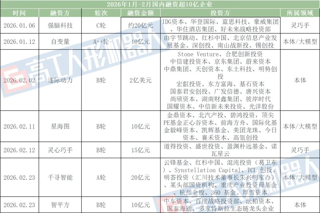 除了上述两家企业,自变量、智平方、逐际动力、星海图、灵心巧手这5家企业,均在1月2月实现了单笔融资金额达10亿或以上的成就。