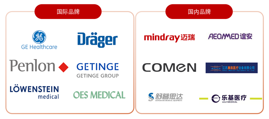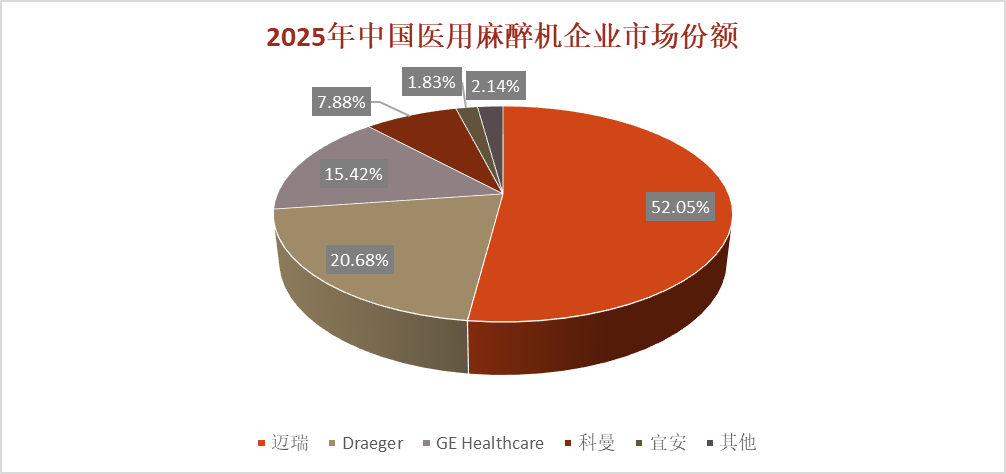 国际麻醉机品牌依托长期积累的核心技术能力和全球化品牌优势,在我国中高端医疗机构中保持稳固地位。以GE Healthcare(通用电气医疗) 和 Dräger(德尔格) 为代表的厂商,产品在麻醉精度、系统稳定性、生命体征多参数监测及信息化集成方面具备显著优势,广泛应用于大型三甲医院及复杂、高风险手术场景。其中,GE Healthcare 强调麻醉系统与监护设备的一体化解决方案,能够满足多学科手术对精准麻醉管理的需求;Dräger则凭借在呼吸与麻醉领域的百年技术积累,在安全性和可靠性方面树立了行业标杆。在政策支持、临床需求升级及技术持续突破的推动下,国内麻醉机厂商近年来实现快速成长,国产替代进程明显加快,2025年我国麻醉机国产品牌占比为64%,。迈瑞医疗(Mindray) 作为国内医疗设备龙头,其麻醉机产品已覆盖从基层医疗机构到三甲医院的多层级应用场景,凭借较高的性价比、可靠的产品性能以及完善的本土化售后服务体系,在招采市场中占据领先地位。谊安医疗(Aeonmed) 深耕麻醉与呼吸设备领域,以适配基层医疗需求的产品策略实现快速渗透,并通过高端机型的持续研发,逐步提升在三甲医院中的应用比例。而科曼医疗(Comen)、舒普思达、乐基医疗 等企业聚焦中小型医院和民营医疗机构等细分市场,依托灵活的产品迭代和贴近临床的功能设计,不断扩大市场覆盖范围,成为推动我国麻醉机市场结构优化和国产替代深化的重要力量。