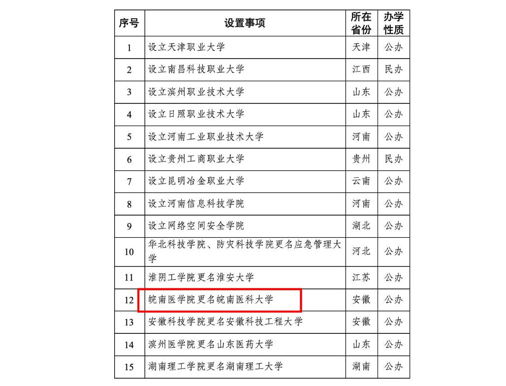 安徽省第三所医科大学来了! 2026年1月4日,教育部官网发布的《关于拟同意设置本科高等学校的公示》其中,皖南医学院更名为皖南医科大学的申请已获通过,这意味着安徽省的第三所医科大学即将到来! 皖南医学院的更名是该校从“学院”迈向“大学”的实质性跨越。事实上,这也是安徽省高等教育规划中的一个重要目标。 早在2023年2月,经安徽省人民政府同意并报教育部备案,皖南医学院更名为皖南医科大学的事项,已被正式列入《安徽省“十四五”高等学校设置规划》。 经过一年多的筹备,2024年11月4日,安徽省教育厅发布公示,表示经安徽省高等学校设置评议委员会专家考察和评议,同意将皖南医学院更名事宜报请省政府向教育部申报。直至此次教育部公示期开始,这项历时数年的升格工作终于进入最后阶段。 皖南医学院的办学历史可追溯至1958年,其前身为芜湖医学专科学校。此后学校历经变迁:1971年并入安徽医学院,成为安徽医学院皖南分院;1974年经国务院批准独立建校,正式命名为皖南医学院。 独立建校后,学校发展步入正轨:1981年获得学士和硕士学位授予权,是全国首批临床医学硕士专业学位研究生培养模式改革试点高校,目前有一级学科硕士学位授权点7个、硕士专业学位授权类别8个。 目前,学校拥有滨江、赭麓、银湖等多个校区,占地超过1800亩。作为安徽省重点支持立项建设博士学位授予单位,该校设有临床医学院、基础医学院、公共卫生学院、药学院、法医学院、麻醉学院等16个二级学院,学科建设涵盖医、理、工、管、经、法、教育7个门类。 附属医院体系是衡量医科大学实力的核心指标之一。截至目前,皖南医学院拥有直属附属医院3所,非直属附属医院8所,教学医院26所。 其中第一附属医院(弋矶山医院)建于1888年,由美国基督教会创办,是安徽省第一所西医医院和全国首批三级甲等医院;第二附属医院始建于1949年,前身系中国人民解放军皖南军区直属附院,2012年整体划转皖南医学院成为直属附属医院后实现快速发展,成为一所集医疗、教学、科研、预防、保健、康复多功能于一体的公立三级甲等综合医院。 2025年7月4日,皖南医学院附属太和医院签约揭牌仪式在安徽太和县举行。太和县人民医院以直属附属医院模式纳入皖南医学院管理体系,成为皖南医学院第三所直属附属医院,同时也是县级医院中罕见成为医学院校直属附属医院的案例。 在皖南医学院升格为医科大学之前,安徽省内已有两所以“医科大学”命名的高校,分别是安徽医科大学和蚌埠医科大学。 安徽医科大学:安徽医学教育发源地 安徽医科大学是安徽省历史最悠久的医学院校,也是省内第一所高等医科院校,在省内有“医学教育发源地”的重要地位。其历史可追溯至1926年5月在上海创办的私立东南医科大学,1949年底内迁至安徽。 学校于1996年6月更名为安徽医科大学。作为省部共建的省属重点大学,该校学科实力雄厚,学校医学及相关学科门类齐全,已形成学士、硕士、博士完整的教育培养体系。 当前学校共有45个本科专业,覆盖医学、理学、管理学、工学、法学、教育学等6个学科门类。共有博士学位授权一级学科4个,博士学位授权二级学科44个,4个博士后科研流动站。拥有研究生学院、基础医学院、公共卫生学院、口腔医学院、卫生管理学院、药学院、护理学院等20个直属教学机构。 在附属医院体系方面,安徽医科大学拥有第一附属医院、第二附属医院、附属口腔医院、附属巢湖医院、附属阜阳医院等5所直属附属医院,另有安徽省公共卫生临床中心(安徽省传染病医院、第一附属医院北区)和6所共建附属医院、3所非直属附属医院、3所医学中心、3所附属疾病预防控制中心,医联体合作单位300余家。 其中安徽医科大学第一附属医院拥有多个院区,开放床位7055张,2024年度门诊人次770.4万,出院人次35.84万,手术台次25.89万。医院连续6年在全国三级公立医院绩效考核中获得A+等级,连续13年入选中国最佳医院百强榜。 安徽医科大学第二附属医院于2008年开诊,虽然建院时间相对较晚,但发展迅速。医院目前开放床位2650张,共有呼吸与危重症医学科、血液内科、眼科三个国家临床重点专科建设项目,在国家卫生健康委公布的2023年度全国三级公立医院绩效监测(国考)中位列全国67名,连续四年稳居A+等级。 新晋医科大学:蚌埠医科大学 除了这家老牌医科大学,蚌埠医科大学也是安徽省近年来新“晋级”的医科大学,于2024年1月6日正式揭牌。 1958年7月,国家决定由原上海第二医学院(现上海交通大学医学院)和安徽医学院(现安徽医科大学)援建创立蚌埠医学院。2023年11月,经教育部批准,学校更名为蚌埠医科大学。 学校是国家首批具有学士和硕士学位授予权单位,教育部硕士研究生推免高校,国家首批卓越医师教育培养计划试点高校,全国首批专科医师规范化培训基地。 学校承继了上海第二医学院完整教学体系和优良育人传统,66年来为国家输送了15万名优秀医学人才,获批建设2个国家区域医疗中心,为安徽省高等教育和卫生健康事业发展作出重要贡献。 值得一提的是,从该校走出了5名两院院士,院士数量在安徽省属高校排名并列第一。 官网当前信息显示,学校现有2所直属附属医院、10所非直属附属医院,承担了皖北地区近3000万人口医疗服务任务。 其中,蚌埠医学院第一附属医院占地