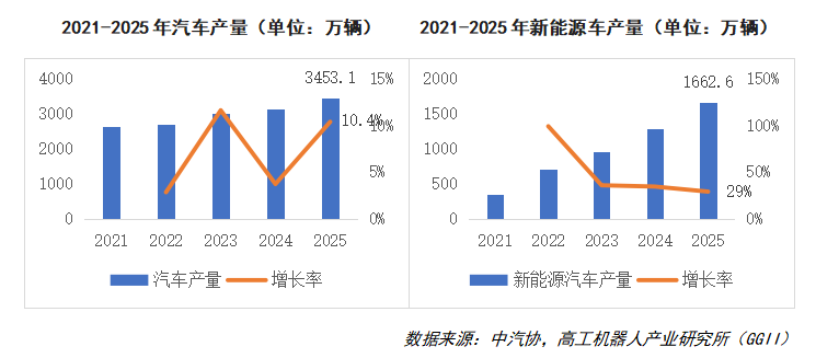 行业方面,汽车及零部件、食品包装、机械加工、锂电等工业领域持续保持高景气,为国产协作机器人的销量增长筑牢了坚实基础。 一方面,2025年汽车工业实现高质量发展,汽车产量连续三年保持3000万辆以上规模。据中汽协数据显示,2025年汽车产销量分别达到3453.1万辆和3440万辆,同比分别增长10.4%和9.4%。