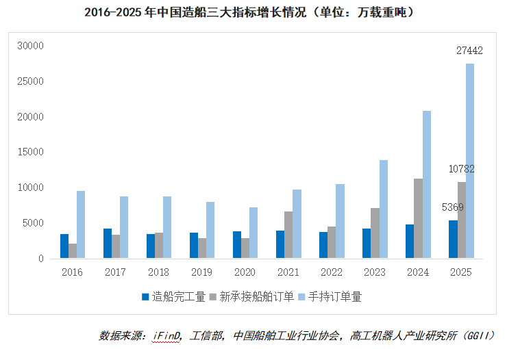 据工信部数据显示,我国造船完工量及新承接船舶订单整体呈震荡上行的趋势,2025年我国造船完工量、新承接船舶订单分别达到5369万载重吨、10782万载重吨。据中国船舶工业行业协会数据显示,2025年我国船舶企业手持订单量达到27442万载重吨,同比增长31.47%。