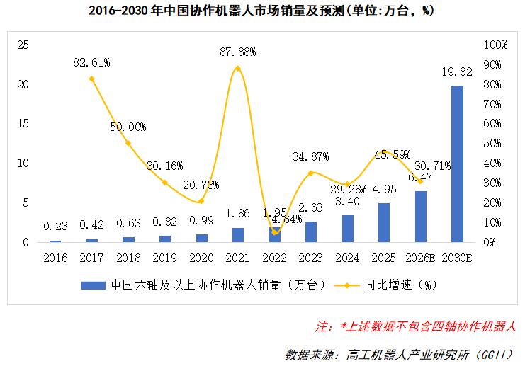 近年来,中国协作机器人产业展现出强劲的增长势头,国产厂商凭借精准的市场定位、过硬的产品品质和高性价比优势,在国内协作机器人市场占据超90%的份额,全球竞争力也持续攀升。国产协作机器人厂商取得这一亮眼成绩,是下游行业需求、场景应用渗透、产品迭代升级、全球化布局等多重因素共同作用的结果。高工机器人产业研究所(GGII)数据显示,2025年中国协作机器人市场销量约4.95万台,同比增长45.59%。GGII预计2026年中国协作机器人市场销量有望突破6万台,持续保持高增长的态势,到2030年中国协作机器人市场销量有望突破19万台。