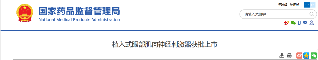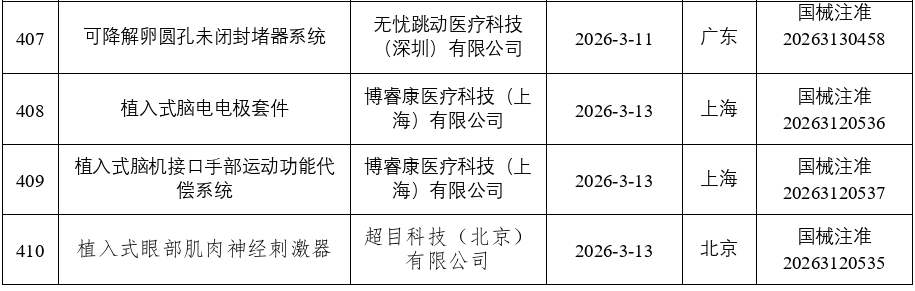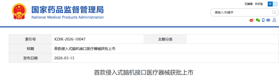 药品监督管理部门将加强该产品上市后监管,保护患者用械安全。 批准了博睿康医疗科技(上海)有限公司植入式脑机接口手部运动功能代偿系统创新产品注册申请,实现脑机接口医疗器械全球首发上市,标志着国际首个侵入式脑机接口医疗器械进入临床应用阶段。 该产品由脑机接口植入体、植入式脑电电极套件、脑电信号收发器、气动手套设备、一次性手术工具包、脑电解码软件、医用测试软件、临床管理软件组成。适用于颈段脊髓损伤所致四肢瘫患者,通过气动手套设备辅助实现手部的抓握功能代偿。患者需满足以下条件:18岁到60岁,C2~C6颈段脊髓损伤评级A~C级的四肢瘫,疾病确诊超过1年且经规范治疗后病情稳定至少6个月,手部无法完成抓握,上臂尚存部分功能。该产品采用硬脑膜外微创植入与无线供能通信技术,临床试验结果显示,受试者通过该产品实现了手部抓握能力的明显提高,进而改善患者生活质量。 近年来,国家药监局坚决贯彻落实党中央、国务院关于健全支持创新医疗器械发展机制重大决策部署,出台细化举措,强化部门协同,鼓励医工融合和科研转化,全力支持高端医疗器械重大创新,促进更多新技术、新材料、新工艺和新方法应用于医疗健康领域。脑机接口作为“十五五”规划纲要确定的未来产业,国家药监局高度重视,在产品审评审批中倾斜资源,按照“提前介入、一企一策、全程指导、研审联动”原则,对创新产品开展前置审评服务,有效加快产品上市进程,切实提升了我国高端医疗器械国际竞争力。 批准了超目科技(北京)有限公司的植入式眼部肌肉神经刺激器注册申请。