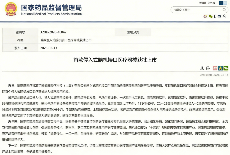 很多人看到脑机接口,第一反应就是意念操控、科幻变成现实、人机融合,可我得先把这事拉回到现实:这次获批的产品, 是一款明确针对医疗康复场景的器械,它主要是针对脊髓损伤导致肢体运动障碍的患者,帮助他们恢复部分手部抓握、拿东西、自主进食等基础生活能力, 它的核心是“代偿功能”、“医疗辅助”,不是大众想象的“大脑增强”或者“超级能力”, 这也是它能成为全球首个获得正规医疗器械准入的关键——定位清楚、目标实际、临床扎实、安全可控。