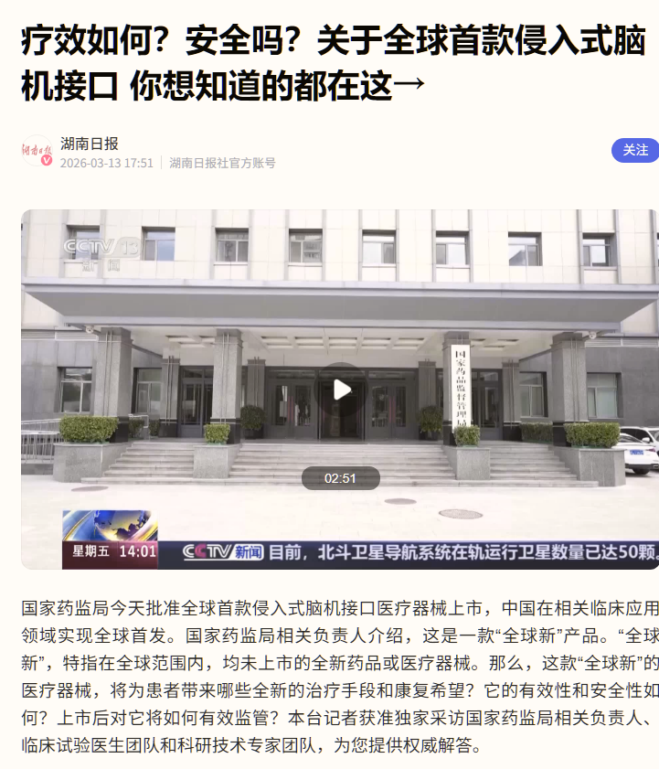 当国家药监局正式批准国内首款侵入式脑机接口系统作为三类医疗器械上市的消息公布的时候, 我没有马上加入“中国科技弯道超车”、“意念时代到来”的舆论狂欢。反过来更想要从专业、理性、接近行业真实生态的角度和大家好好说说这件事的真正价值,还有我们最应该保持的判断。
