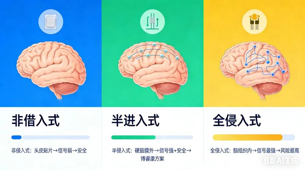 非侵入式像隔着厚墙听声音,电极贴在头皮上,安全无创,但信号经过颅骨衰减,精度有限;全侵入式直接把电极扎进脑组织,信号清晰但可能损伤大脑、引发感染。