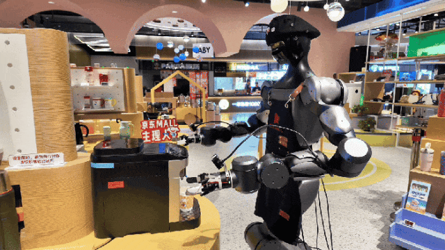 在此次合作中,京东全面开放其线下业态资源。目前,千寻智能的人形机器人Moz已经在京东MALL线下门店正式“上岗”,承担咖啡制作的演示与服务任务。而这一线下门店,正是去年年底京东联手宇树推出的智能机器人的销售和体验中心。值得注意的,Moz在该门店的服务并非自主行动,而是遥操作。