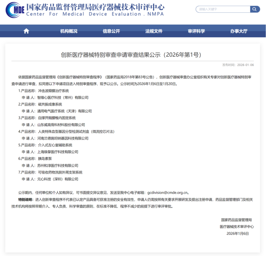 依据国家药品监督管理局《创新医疗器械特别审查程序》(国家药监局2018年第83号公告),创新医疗器械审查办公室组织有关专家对创新医疗器械特别审查申请进行审查,拟同意以下申请项目进入特别审查程序,现予以公示。公示时间为2026年1月6日至1月20日。 1.产品名称:冲击波瓣膜治疗系统 申请人:智维心医疗科技(常州)有限公司 2.产品名称:磁共振成像系统 申请人:通用电气医疗系统(天津)有限公司 3.产品名称:自撑开胸腰椎内固定系统 申请人:山东威高骨科材料股份有限公司 4.产品名称:人类特殊血型基因分型检测试剂盒(微流控芯片法) 申请人:河南兰德施坦纳基因科技有限公司 5.产品名称:介入式左心室辅助系统 申请人:上海焕擎医疗科技有限公司 6.产品名称:胰岛素泵 申请人:苏州和淳医疗科技有限公司 7.产品名称:可吸收药物洗脱外周支架系统 申请人:元心科技(深圳)有限公司 公示期内,任何单位和个人如有异议,可书面提交异议意见,发送至我中心电子邮箱:gcdivision@cmde.org.cn。 特别说明:进入创新审查程序不代表已认定产品具备可获准注册的安全有效性,申请人仍需按照有关要求开展研发及提出注册申请,药品监督管理部门及相关技术机构将按照早期介入、专人负责、科学审查的原则,在标准不降低、程序不减少的前提下进行审评审批。 国家药品监督管理局 医疗器械技术审评中心 2026年1月6日 医疗器械创新网评价: 本次名单的显著特点是聚焦核心、多点开花。“冲击波瓣膜治疗系统”无疑是焦点,其代表的“无植入”修复理念,实现了从“置换”到“修复”的范式革新,为患者提供了全新选择。与此同时,产品线覆盖了影像诊断(磁共振系统)、有源植入(左心室辅助系统、胰岛素泵)、高值耗材(可吸收支架、骨科系统)及精准诊断(基因分型试剂盒)等多个关键领域,显示出创新生态的全面性与协同性。 值得注意的是,创新引擎呈现出鲜明的区域集聚与政产联动效应。以冲击波系统为例,其背后是苏州工业园区培育的龙头企业、顶尖临床机构与国家级重点实验室的深度协同。常州、上海等地亦有产品上榜,这些区域的成功,与地方政府“早期介入、专人负责、主动靠前”的精准培育服务密不可分。这揭示出一条规律:顶尖的医疗器械创新,已不再是企业的单打独斗,而是区域创新体系综合实力的角逐。 |