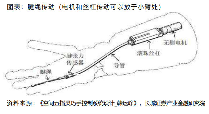 常见传动方式:腱绳传动、连杆传动、齿轮传动等,其中腱绳传动、连杆传动是目前应用最广泛的方案。