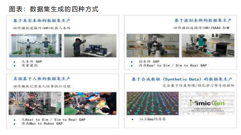 • 最佳的数据取得方式是通过机器人本体进行采集的 ,但获取成本高限制了其数量。通过人类示教、真机作业采集等方式,获取物理世界中的多模态交互数据。国内人形国创中心的具身智能训练场,依托百台机器人和多样场景,积累异构虚实通用数据集,支撑模仿学习与技能训练。
