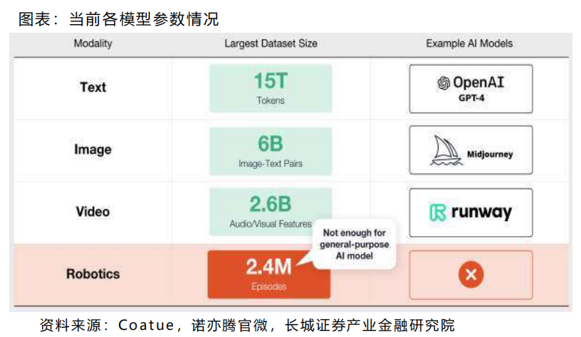 • 而现阶段机器人模型的数据集规模仅为 2.4M(百万级),距离实现机器人通用模型的目标还相去甚远。