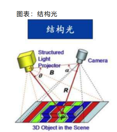 • 结构光: 基本原理为采用一个光源装置代替双目视觉中的一个摄像机, 用光源装置向场景中投射已知图案, 用摄像机捕获图案, 根据系统几何关系和三角测量原理获得待测物体的深度信息。