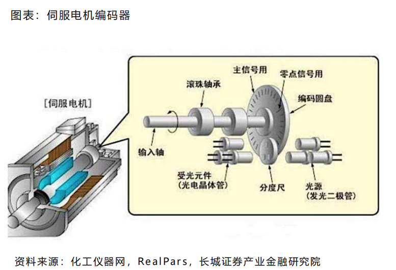 编码器:可以实时反馈电机转子的位置、转速和运动方向(是位置or速度传感器),从而实现精准控制。原理有很多种,如光电编码器、磁编码器、电容式编码器等,其中光电式是精度更高、不受电磁干扰,是主流选择。编码器的壁垒主要是在于码盘精度、装配工艺、误差补偿技术。主要指标是精度和寿命。