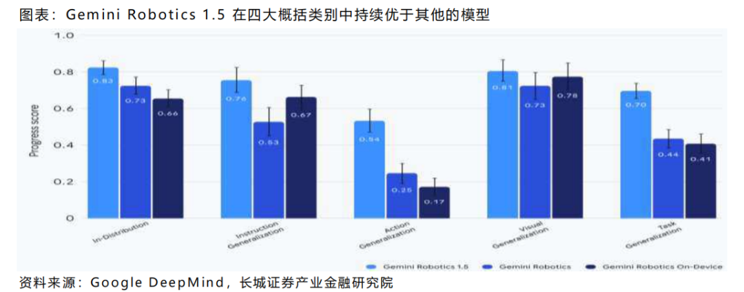 谷歌:谷歌机器人大模型迭代至Gemini Robotics 1.5 ,一种多形态视觉-语言-动作(VLA)模型,以及Gemini Robotics-ER 1.5 ,一种最先进的具身推理(ER)模型。该模型具有几大创新点:首先,Gemini Robotics 1.5具有新颖的架构和运动迁移(MT)机制,使其能够从异构、多形态的机器人数据中学习,从而使VLA更加通用。其次, Gemini Robotics 1.5将动作与多层次的内部自然语言推理过程交错进行。这使机器人能够“先思考后行动”,显著提升其分解和执行复杂多步骤任务的能力, 同时也让机器人的行为对用户更具可解释性。 第三, Gemini Robotics-ER 1.5在具身推理方面建立了新的最先进水平,即在机器人关键能力的推理方面,如视觉和空间理解、任务规划及进度估计。