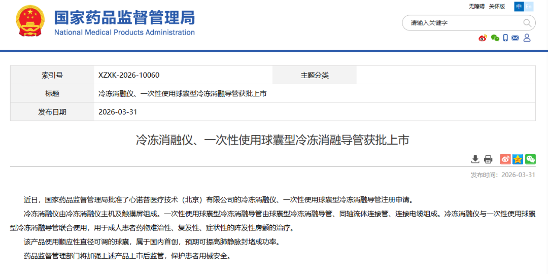 2026年3月31日,国家药监局正式批准了心诺普医疗的冷冻消融系统上市。该系统包含冷冻消融仪和一次性使用球囊型冷冻消融导管,属于第三类医疗器械。 这款产品的最大亮点,是其国内首创的“顺应性直径可调球囊”。 我们都知道,每位患者的肺静脉解剖结构各不相同。传统的固定尺寸球囊难以完美贴合所有血管形态,而这款球囊能根据肺静脉口的直径自动调整大小,实现更好的贴靠与封堵,有望显著提高肺静脉隔离的成功率,让手术更精准、更高效。 该系统专为治疗成人药物难治性、复发性、症状性的阵发性房颤而设计,通过低温冷冻技术,隔离肺静脉,阻断引发房颤的异常电信号。 除了自适应球囊,系统还融合了多项创新技术。其压力流量双控制技术,能实时监控并稳定球囊内的压力和制冷剂流量,确保消融过程平稳可控。 导管内的特殊流体喷射装置,能让球囊表面的温度分布更均匀,避免消融不彻底或组织损伤。集成的球囊内压力监测功能,可以实时反馈球囊与组织的接触情况,帮助医生判断贴靠是否良好。 心诺普医疗的这款创新产品,为众多房颤患者提供了一个全新的微创治疗选择。它的上市,标志着我国在高端心脏电生理器械领域又迈出了坚实的一步。