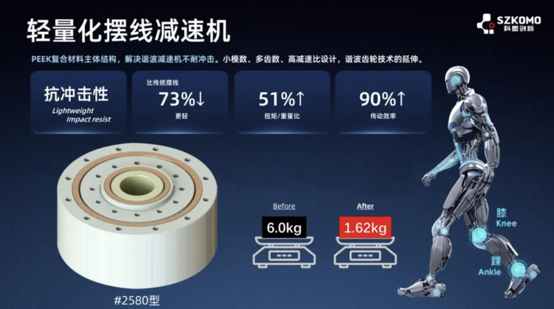 在人形机器人领域,摆线减速器目前的核心应用集中在下半身高负载关节,如腰、髋、膝盖、踝部等关节,且随着机器人轻量化需求的提升,采用PEEK等轻量化材料已成为行业趋势。