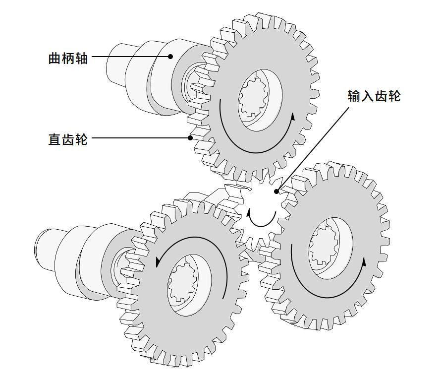 工作原理: 第一级减速:伺服电动机旋转-输入齿轮传动至直齿轮,曲柄轴直接连接在直齿轮上,与直齿轮旋转数一致;曲柄轴的偏心部中,通过滚针轴承安装了2个RV齿轮,目的是取得力的平衡;随着曲柄轴的旋转,偏心部中安装的2个RV齿轮也跟着做偏心运动。