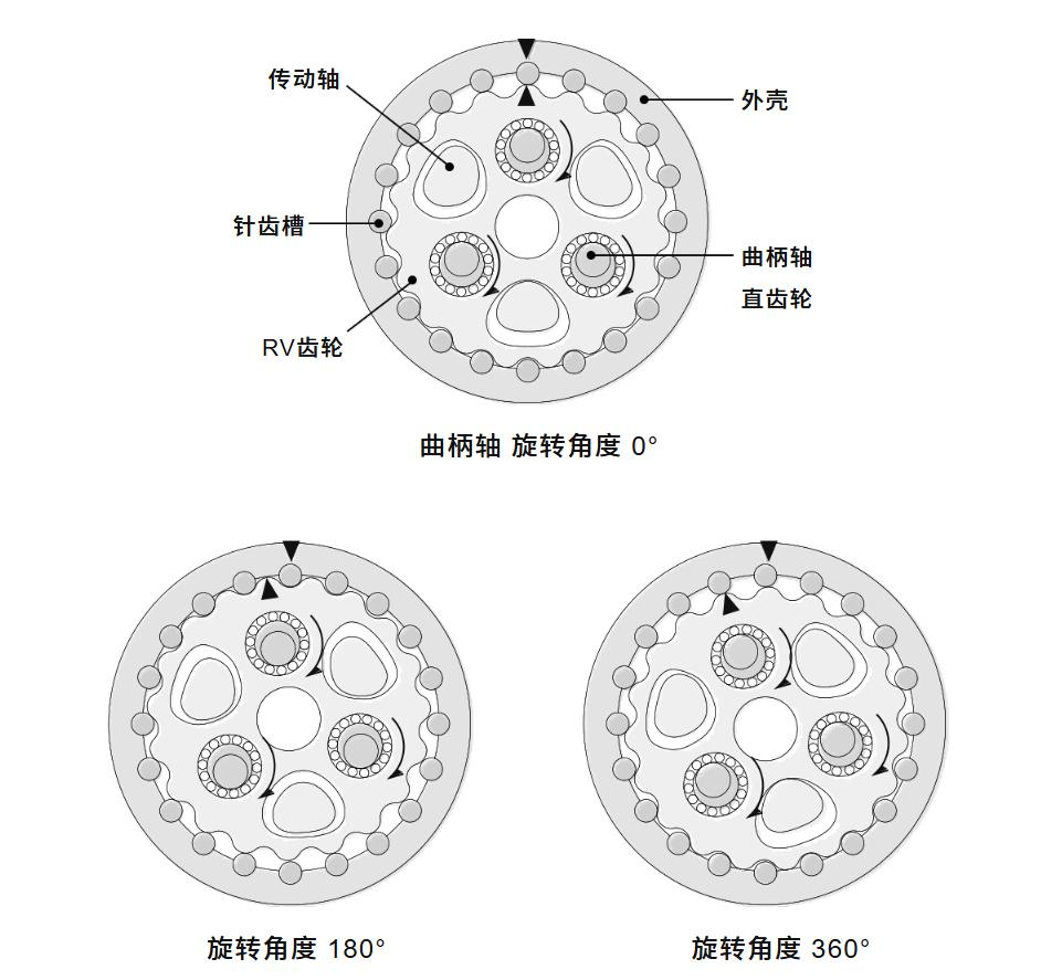 第二级减速:在壳体内侧的针齿槽里,比RV齿轮的齿数多一个的针齿槽等距排列,曲柄轴旋转一次,RV齿轮与针齿槽接触的同时作一次偏心运动,RV齿轮沿着与曲柄轴的旋转方向相反的方向旋转一个齿轮距离,借助曲柄轴在输出轴上取得旋转。