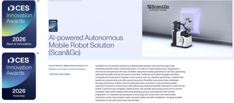 2026 年国际消费电子展(CES)的聚光灯聚焦拉斯维加斯会展中心,工业机器人 AI 领域诞生焦点时刻 —— 源自和意精工的 AARS(自主自适应机器人系统)技术,携手合作伙伴斗山机器人(Doosan Robotics),一举斩获 CES 2026 “人工智能” 类别 “最佳创新” 奖,同时入选 “机器人” 类别创新奖荣誉名单,成为本届 CES 唯一在双核心赛道获奖的工业机器人智能化技术!