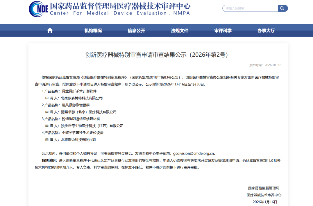 依据国家药品监督管理局《创新医疗器械特别审查程序》(国家药监局2018年第83号公告),创新医疗器械审查办公室组织有关专家对创新医疗器械特别审查申请进行审查,拟同意以下申请项目进入特别审查程序,现予以公示。公示时间为2026年1月16日至1月30日。 1.产品名称:骨盆骨折手术计划软件 申请人:北京罗森博特科技有限公司 2.产品名称:磁共振影像增强器 申请人:清超卓影(北京)医疗科技有限公司 3.产品名称:脱细胞阴道组织修复材料 申请人:独步吾奇生物医疗科技(江苏)有限公司 4.产品名称:全髋关节置换手术定位设备 申请人:北京医迈科技有限公司 公示期内,任何单位和个人如有异议,可书面提交异议意见,发送至我中心电子邮箱:gcdivision@cmde.org.cn。 特别说明:进入创新审查程序不代表已认定产品具备可获准注册的安全有效性,申请人仍需按照有关要求开展研发及提出注册申请,药品监督管理部门及相关技术机构将按照早期介入、专人负责、科学审查的原则,在标准不降低、程序不减少的前提下进行审评审批。 国家药品监督管理局 医疗器械技术审评中心 2026年1月16日 医疗器械创新网评价: 国家药监局创新审查公示的4 款产品,彰显国产医疗科技 “聚焦临床、深耕技术” 的核心逻辑,更锚定行业发展新方向。 骨科数字化实现精准突破:骨盆骨折手术计划软件、全髋关节置换定位设备均在通过智能化设计降低精准医疗门槛,破解传统手术经验依赖、并发症风险高的难题。 影像技术升级夯实诊断根基,磁共振影像增强器提升分辨率与检出率,为早期诊疗提供支撑。 生物材料填补细分空白,脱细胞阴道组织修复材料凭借优质生物相容性与结构稳定性,解决传统材料排异痛点,体现从广谱覆盖到精准适配的转变。 此次公示产品勾勒出国产创新成熟路径:不再是技术模仿,而是基于中国临床场景的原创突破。并且在本次公示中,进入创新通道的企业主要为来自北京、江苏的本土企业,印证了两地区域创新生态的持续完善。 未来行业将聚焦两大方向:以数字化实现精准化诊疗,以垂直深耕挖掘细分化机会。这些具备核心技术壁垒的产品,正打破进口垄断,让创新真正惠及患者,推动国产医疗器械向高质量发展进阶。 我们持续关注并深度链接医疗器械领域的创新力量。如果您是寻求技术转化、融资支持或园区落地的创新企业,或是希望捕捉前沿赛道的投资机构与产业园区,欢迎联系我们。一起助力下一个改变医疗格局的创新,从名单中的“公示”走向市场的“应用”。 文章来源:医疗器械创新网 转载请标注以上来源 |