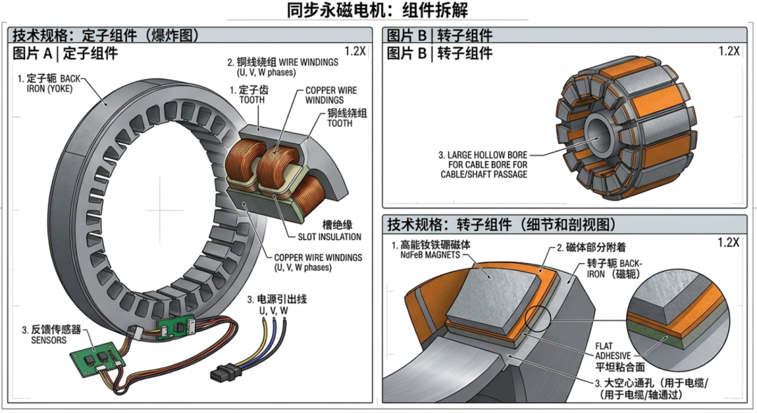 5. 绕线结构与绕组类型(效率与空间的极致平衡):在图片A|定子组件 中,我们可以清晰地看到定子齿上紧密缠绕的铜线。无框力矩电机的绕组设计直接决定了电机的转矩密度、热效应及运动平稳性。- 集中绕组(Concentrated Windings):无框力矩电机绝大多数采用分数槽集中绕组(FSCW),而非传统工业电机的分布式绕组。① 结构特点: 如图中所示,线圈直接缠绕在单个定子齿上。这种结构的端部线圈(End-turn)极短,不跨越多个定子齿。② 设计优势:节省空间: 短端部大幅缩小了电机的轴向长度,使得电机能够做得非常“扁平”,完美契合机器人关节的紧凑需求。降低损耗: 铜线总长度缩短,直接降低了电阻(铜损),提升了效率。提高槽满率: 集中绕组便于自动化绕线,可以将更多的铜线塞进有限的槽空间内。