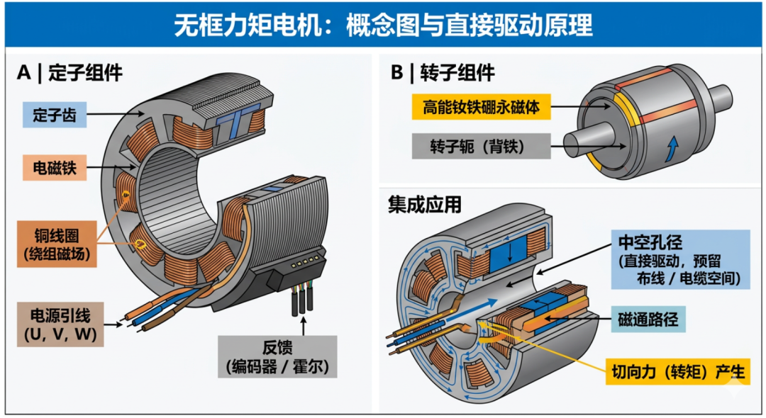 本期推文中,我们将对无框力矩电机做更为详细的分享。 无框力矩电机(Frameless Torque Motor)是现代精密驱动技术的代表,其核心特征是只有定子和转子组件,没有外壳、轴承或轴。在传统的传动系统中,电机通过减速机、联轴器等机械部件连接负载。这种结构存在三个痛点:- 背隙(Backlash):机械连接会导致运动滞后,影响精度。