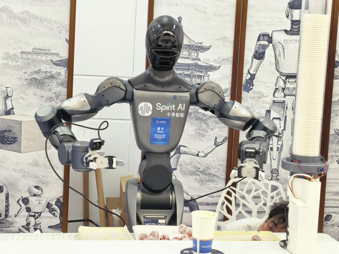 在餐吧的玻璃柜台后,一台来自千寻智能(Spirit AI)的人形机器人 Moz1 正流畅完成着一项 “长程柔性挑战”—— 它的 “双手” 捏住一颗山楂球,对准竹签稳稳刺入,动作连贯一气呵成,一颗颗糖葫芦便被精准串起,一颗不多,一颗不少。