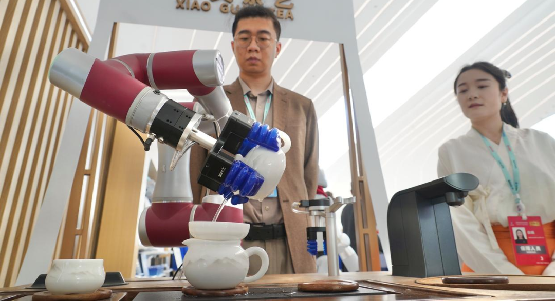 在中关村国际创新中心一层另一侧,一场别开生面的茶事正在上演。睿尔曼机器人、节卡机器人都创新引入“机器人茶艺师”为嘉宾提供泡茶服务。
