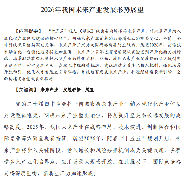 3、赛迪《2026年我国未来产业发展形势展望》:从宏观战略高度,分析了未来产业面临的投入机制、区域不均、人才短板等挑战,并提出了针对性对策。