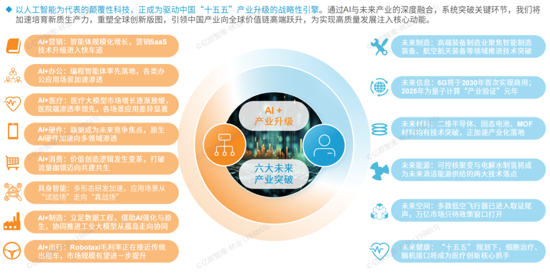 2、亿欧智库《2026六大未来产业发展趋势与人工智能八大落地场景洞察》:深入解读了AI如何赋能各行各业,并描绘了未来制造、信息、材料、能源、空间、健康六大领域的细分赛道与融合案例。